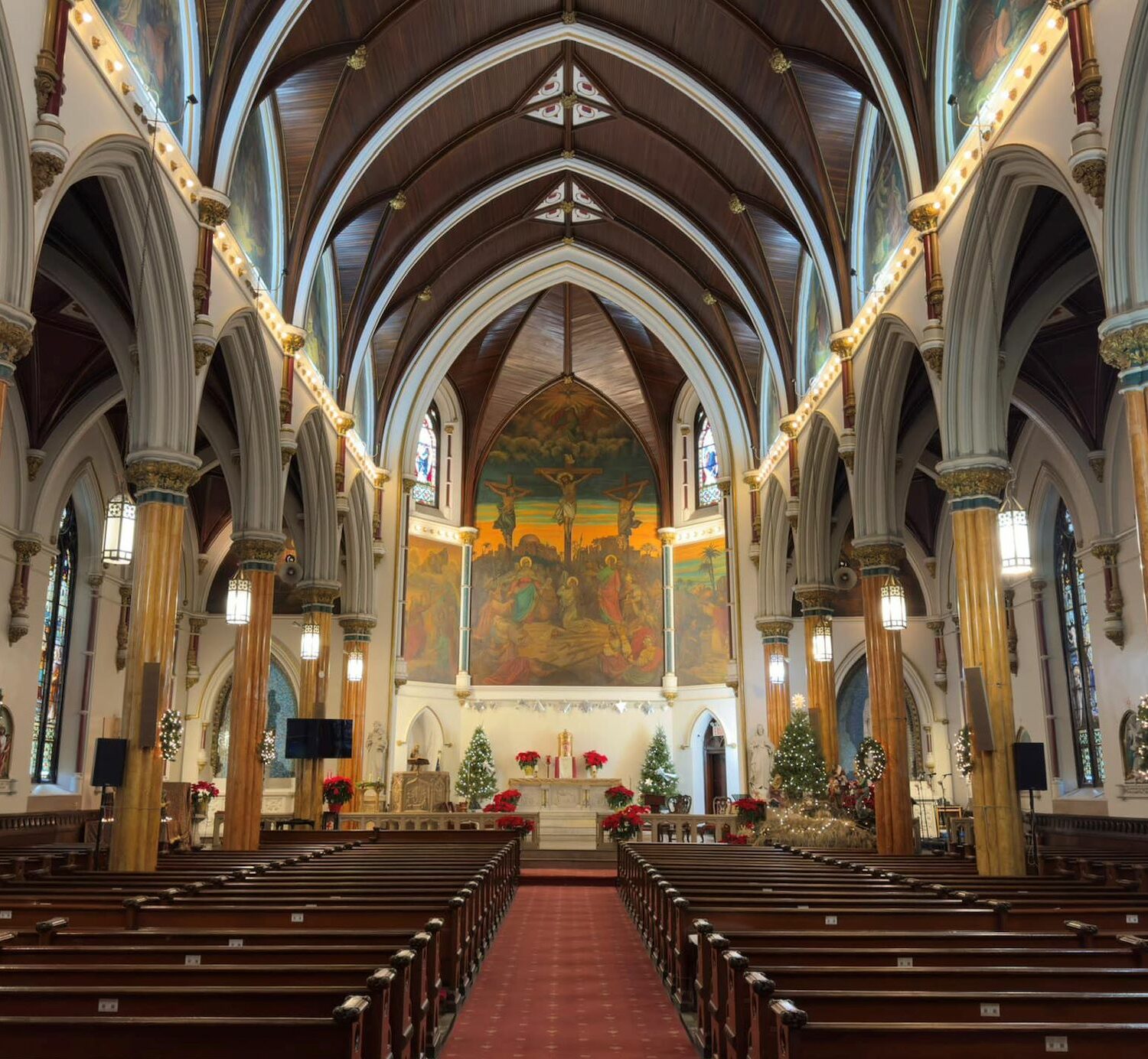 L’edificio attuale è quello ricostruito dopo un devastante incendio nel 1896. Realizzato in stile neogotico con il caratteristico manhattan schist, il campanile porta quattro orologi incorniciati in rame. Le travi di legno che sorreggono il soffitto ricordano la chiglia di una nave, simbolo del viaggio degli immigrati e della loro voglia di costruirsi un futuro.
