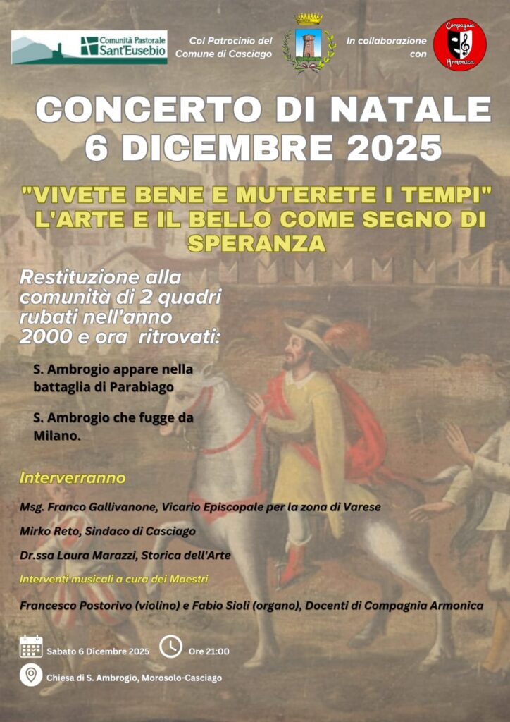 Organizzato dalla Comunità Pastorale Sant’Eusebio con il patrocinio del Comune di Casciago e la collaborazione della Compagnia Armonica, l’evento porta il titolo “Vivete bene e muterete i tempi. L’arte e il bello come segno di speranza”. Un messaggio forte che collega il valore spirituale e civile della bellezza alla sua funzione di riscatto e memoria.