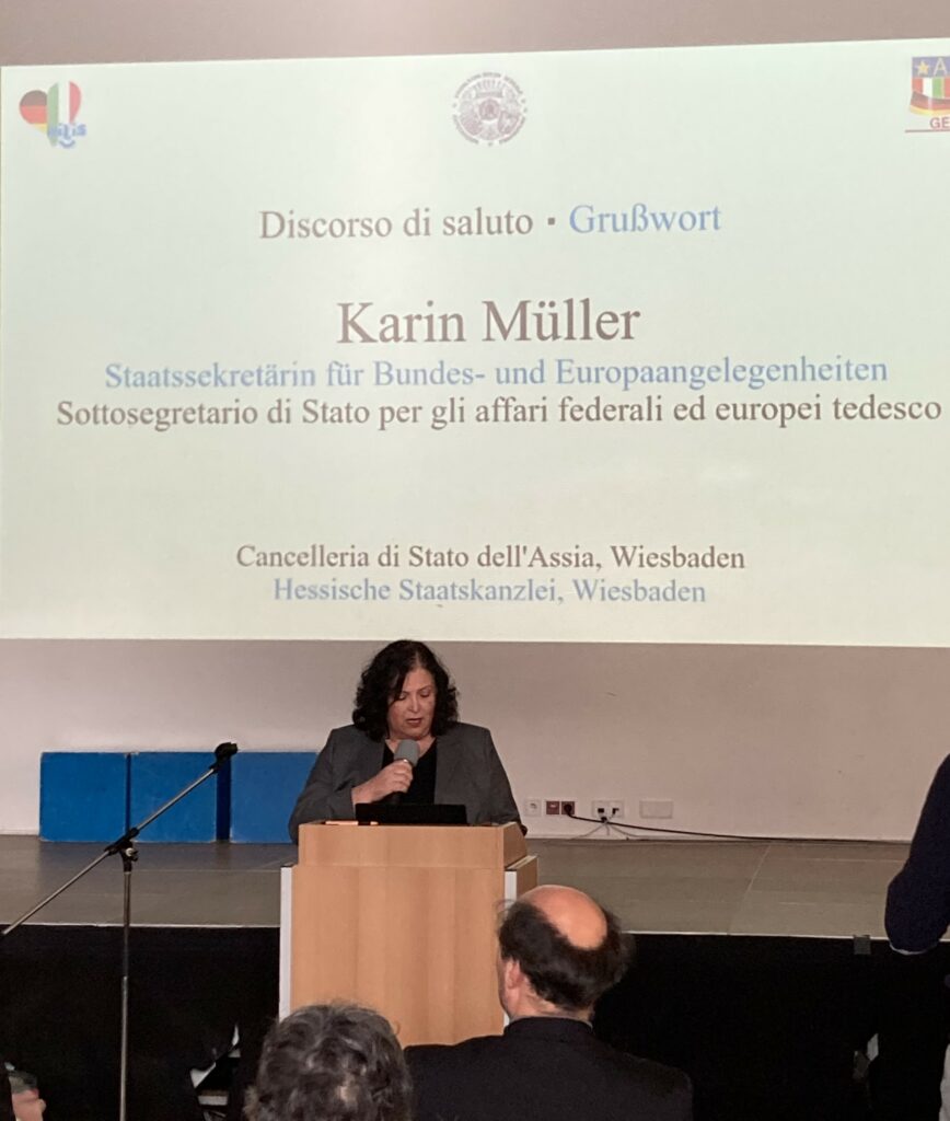 L’importanza della Carta costituzionale a difesa della libertà e democrazia è stata espressa da Karin Müller, sottosegretario di Stato per gli affari federali ed europei della Cancelleria di Stato dell’Assia. Ha ricordato che il Land Assia „sostiene la scuola di pace Monte Sole per promuovere campus di pace in collaborazione con la regione partner Emilia Romagna e mantenere vivo il ricordo della strage di Marzabotto (1944), ha ricordato Karin Müller, dove più di 770 (di cui 213 bambini sotto i 13 anni) persone furono trucidate dai nazisti“. Per questo „i partigiani italiani, il ricordo dei crimini del nazionalsocialismo sono temi per noi importanti in Assia“. I lavori presentati dalle classi scolastiche dal trattamento disumano dei internati militari, fino al trattamento allora di persone con disabilità „sono temi molti diversi che hanno in comune: mostrano come i regimi che classificano le persone in gruppi di migliori o peggiori, perdono in umanità“.