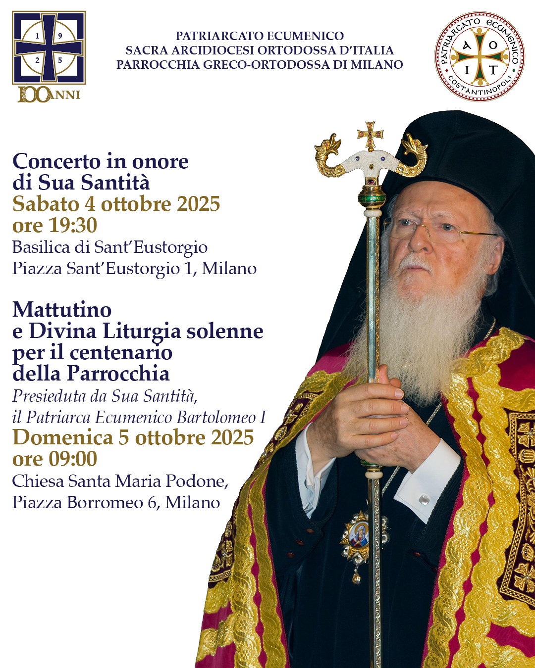 In occasione del centenario dalla fondazione della parrocchia Greco-Ortodossa di Milano, dal 3 al 5 ottobre si svolgerà la visita di Sua Santità Bartolomeo I, Patriarca ecumenico di Costantinopoli.