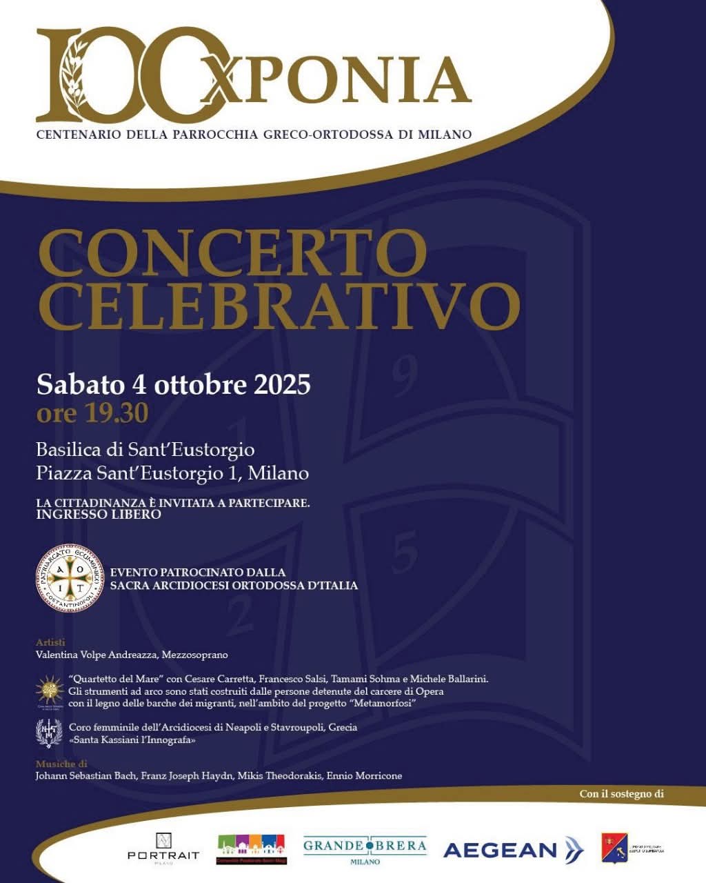 Fitto il programma di eventi milanesi (locandina). Sabato 4 ottobre, alle ore 19.30, concerto in suo onore nella basilica di Sant’Eustorgio, in piazza Sant’Eustorgio 1. Si esibiranno il mezzosoprano Valentina Volpe Andreazza; il “Quartetto del Mare”, con i suoi strumenti realizzati dai detenuti del carcere di Opera con il legno delle barche dei migranti, nell’ambito del progetto «Metamorfosi»; il Coro femminile dell’Arcidiocesi di Neapoli e Stavroupoli, Grecia, «Santa Kassiani l’Innografa». Musiche di Johann Sebastian Bach, Franz Joseph Haydn, Mikis Theodorakis, Ennio Morricone. Ingresso libero (locandina).