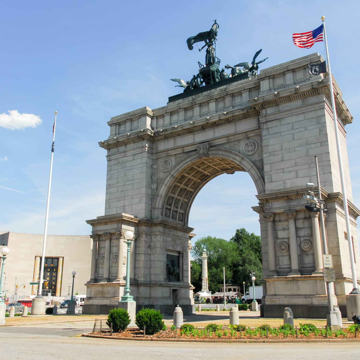 Il piano punta a restituire centralità a due simboli della zona: il Soldiers’ and Sailors’ Memorial Arch e la Bailey Fountain, oggi separati dal parco da carreggiate trafficate e attraversamenti complessi.