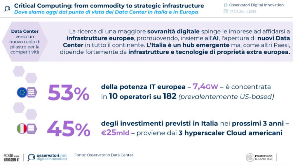 L’Italia si sta posizionando come un nuovo hub europeo nel settore, con la previsione di superare 1 GW di potenza nominale entro il 2028 grazie a potenziali investimenti per 25 miliardi di euro. Lo sviluppo nazionale rimane comunque legato a tecnologie extra-europee, dato che il 45% dei capitali previsti fa capo ai tre principali hyperscaler cloud americani.
