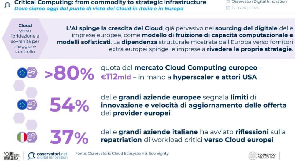 Il mercato del cloud nel continente, valutato 112 miliardi di euro, vede oltre l’80% del controllo in mano a provider statunitensi. Una dipendenza che spinge le organizzazioni a riconsiderare le strategie di sourcing: il 37% delle grandi aziende italiane ha infatti già avviato analisi sulla repatriation dei workload critici verso infrastrutture cloud europee.