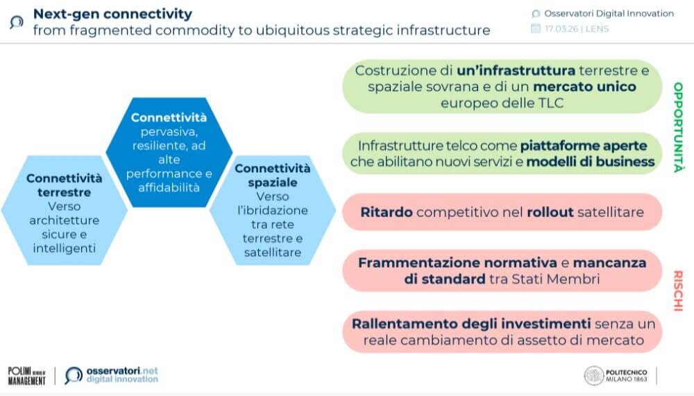 Gli Osservatori Digital Innovation sottolineano l’opportunità per l’Europa di sviluppare un’infrastruttura terrestre e spaziale sovrana che garantisca resilienza, sicurezza e alte prestazioni.