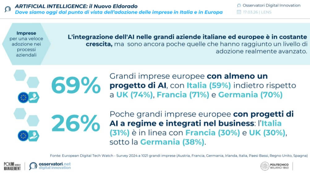 Sul piano delle competenze, il sistema europeo appare fragile, con il 76% delle imprese che fatica a reperire o trattenere talenti specializzati. L’adozione della tecnologia procede con ritmi differenti: il 69% delle grandi aziende europee ha avviato almeno un progetto AI, ma solo il 26% ha raggiunto un’integrazione avanzata nei processi. In Italia, sebbene il 59% delle grandi realtà abbia intrapreso iniziative nell’AI, solo il 31% dichiara un’adozione realmente integrata.