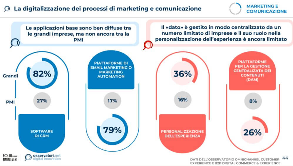 Nel comparto marketing, CRM e marketing automation sono strumenti diffusi in circa l’80% delle grandi aziende, ma meno del 40% riesce a personalizzare in modo profondo il rapporto con il cliente.