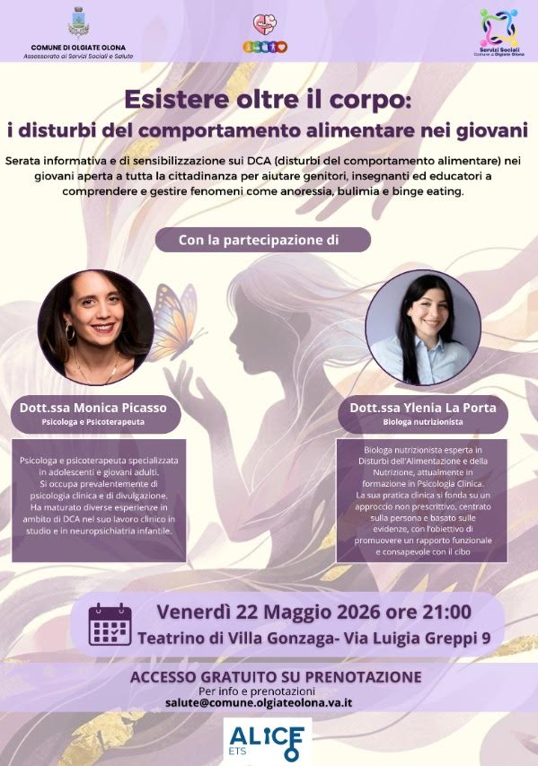 Il Comune di Olgiate Olona accende i riflettori su una delle sfide più complesse che riguarda il mondo giovanile: i disturbi del comportamento alimentare. Attraverso l’Assessorato ai Servizi Sociali e Salute, l’Amministrazione ha organizzato per la serata di venerdì 22 maggio 2026 un incontro pubblico dal titolo «Esistere oltre il corpo», pensato per offrire supporto e conoscenza a famiglie, docenti e operatori del settore educativo.