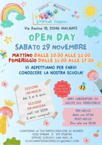 Doppio appuntamento sabato 29 novembre con l’Open day della Scuola materna Leopolda Frascoli di Gurone a Malnate che accoglierà le famiglie e i bambini sia al mattino, dalle ore 10 alle 12, sia il pomeriggio, dalle ore 15 alle 17.