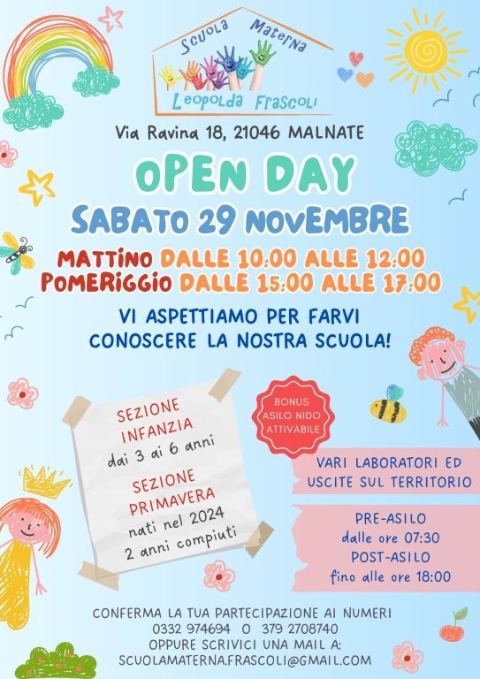 Per confermare la propria partecipazione all’Open day contattare ai numeri 0332 974694 – 379 2708740 la scuola scrivere a scuolamaterna.frascoli@gmail.com.