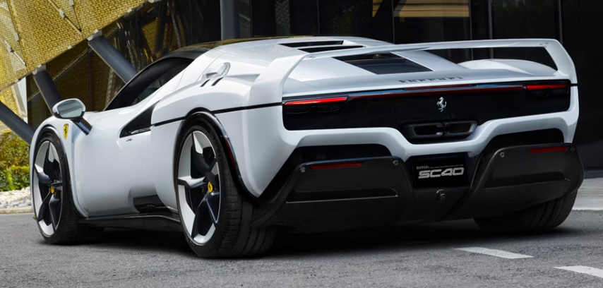 colore Bianco SC40, sviluppato esclusivamente per questo progetto, esalta le superfici scultoree e dona alla vettura una presenza scenica inconfondibile. Dietro, la fascia a griglia che aiuta a raffreddare il motore e le forme tese dell’ala