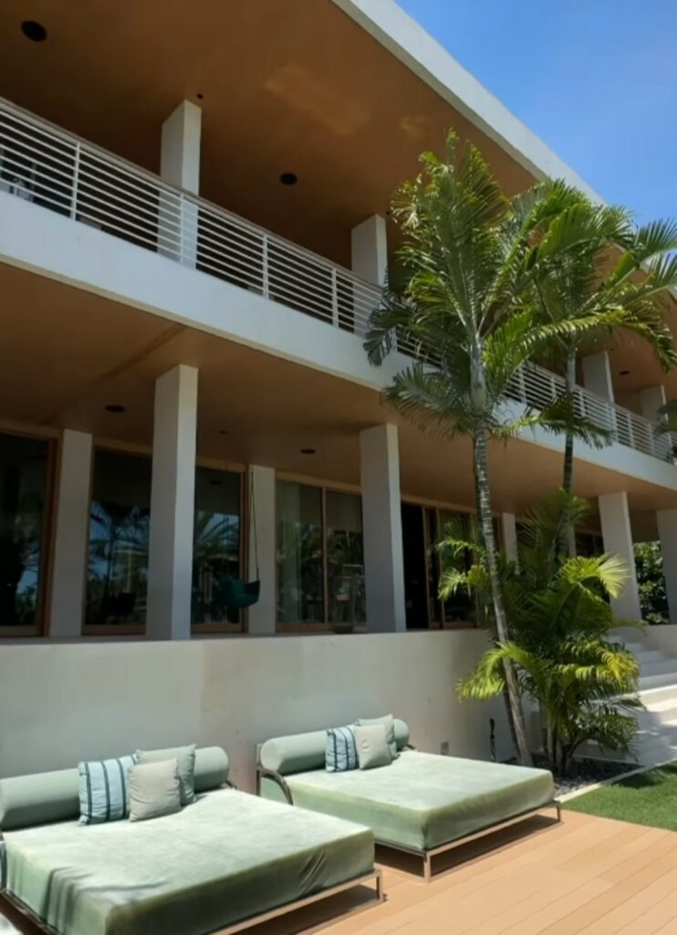 Non è tutto. Il terrazzo della casa si affaccia direttamente sull’oceano: la vista è indimenticabile. Poi c’è la piscina, situata all’ingresso dell’abitazione: grande e scenografica. Eleganza e design nella scelta dell’arredamento, tutto con colori chiari intonati al legno e vimini. Le stesse nuances ci sono pure all’esterno. Immancabile la presenza di altissime palme a rendere tutto ancora più armonioso e raffinato. Le piante circondano proprio la piscina. I lettini sono tutti a due piazze, foderati di spugna verde chiaro. E’ davvero pazzesca.