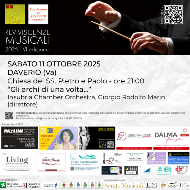 La rassegna “Reviviscenze Musicali” continua con un nuovo appuntamento imperdibile a Daverio, grazie all’organizzazione di ARTandCHARITY O.D.V. e alla collaborazione della Fondazione Jupiter. Sabato 11 ottobre, alle ore 21:00, la Chiesa dei SS. Pietro e Paolo si trasformerà in un palcoscenico musicale di grande suggestione per ospitare il concerto dal titolo “Gli archi di una volta”, che vedrà protagonista l’Insubria Chamber Orchestra, diretta dal M° Giorgio Rodolfo Marini.