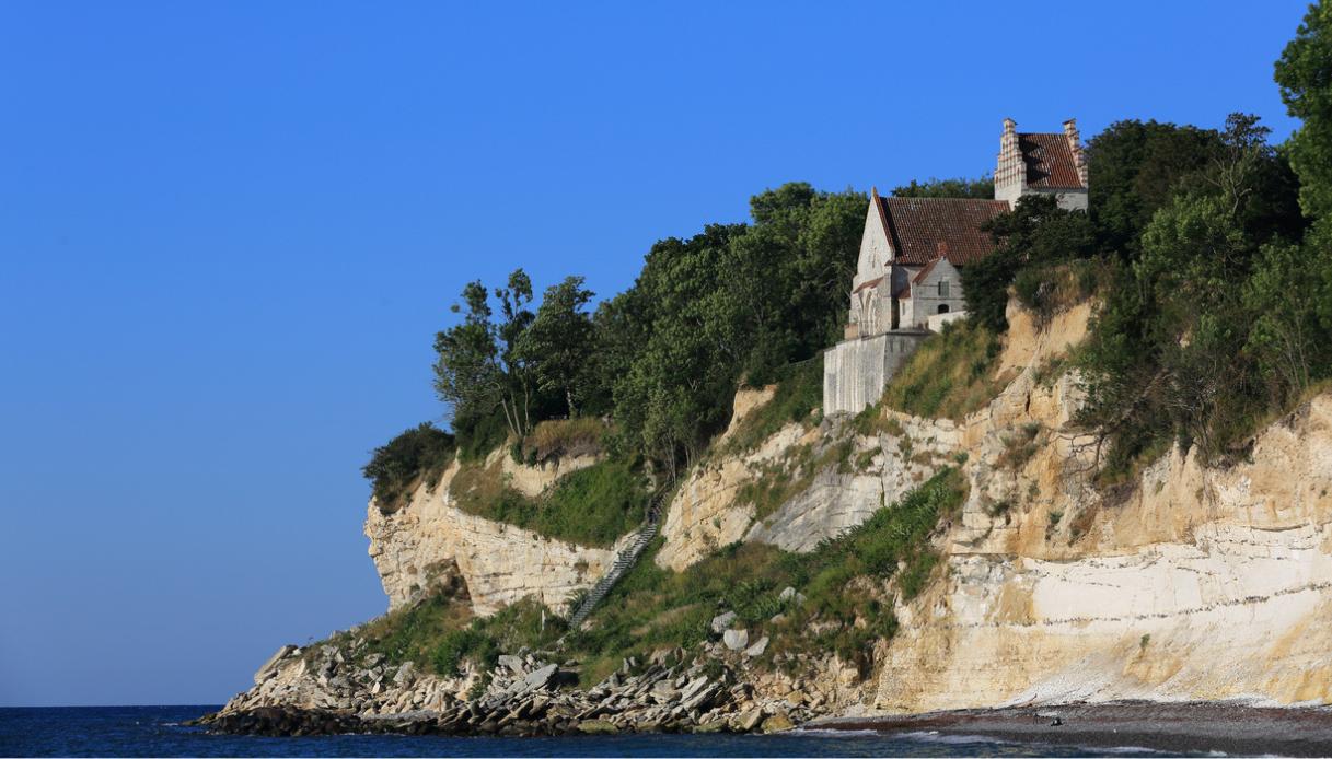 Appena si entra a Højerup, il colpo d’occhio è surreale. Una piccola chiesa in pietra, con tetto spiovente e interni spogli, interrotta bruscamente sul lato dell’altare. Dove una volta c’era il coro oggi c’è una terrazza panoramica, costruita dopo il crollo del 1928, che si affaccia sul blu del mare e sulla drammatica falesia sottostante.