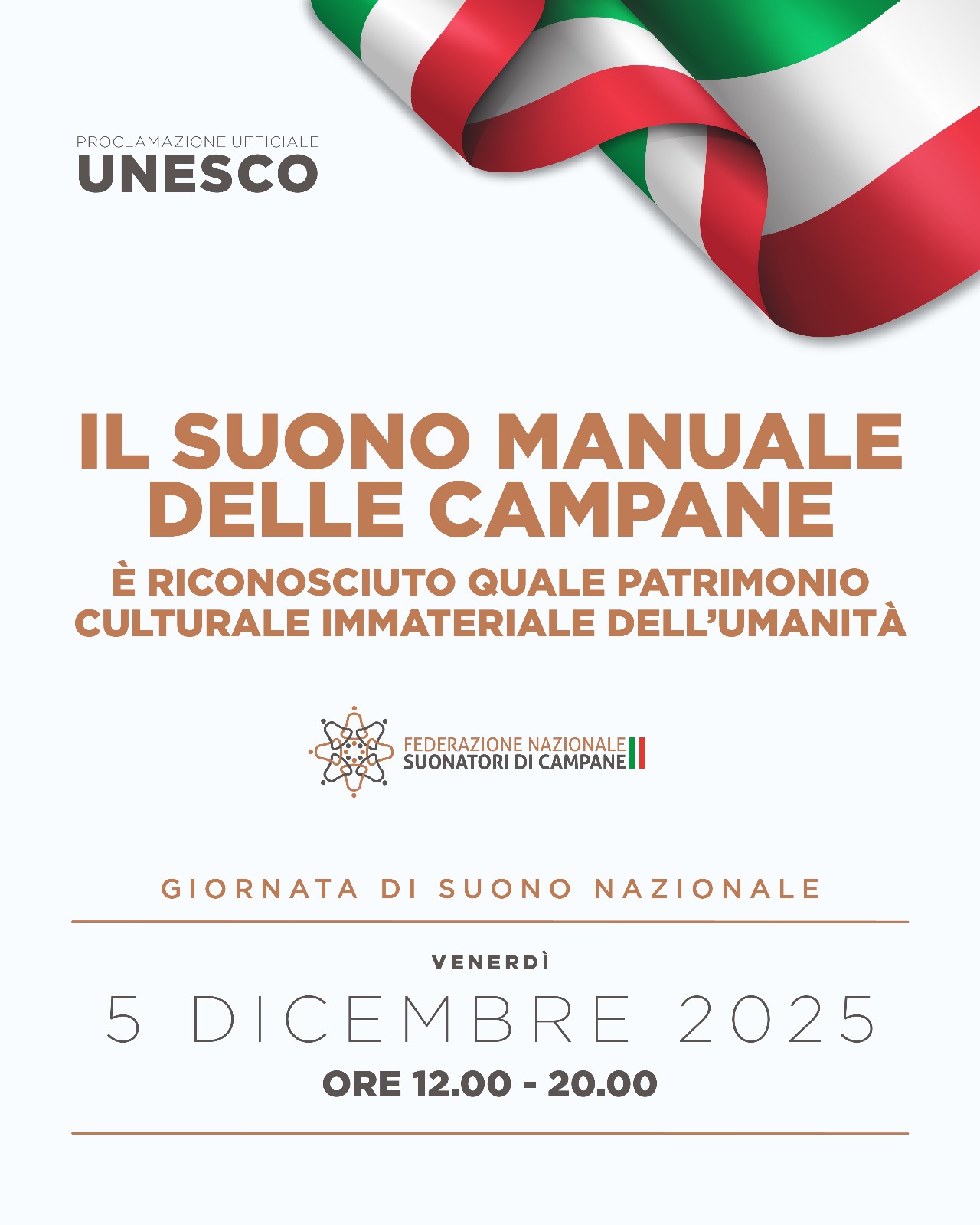 Venerdì 5 dicembre ricorre il I° anniversario della proclamazione dell’Arte Campanaria Tradizionale Italiana quale patrimonio dell’umanità da parte dell’Unesco.