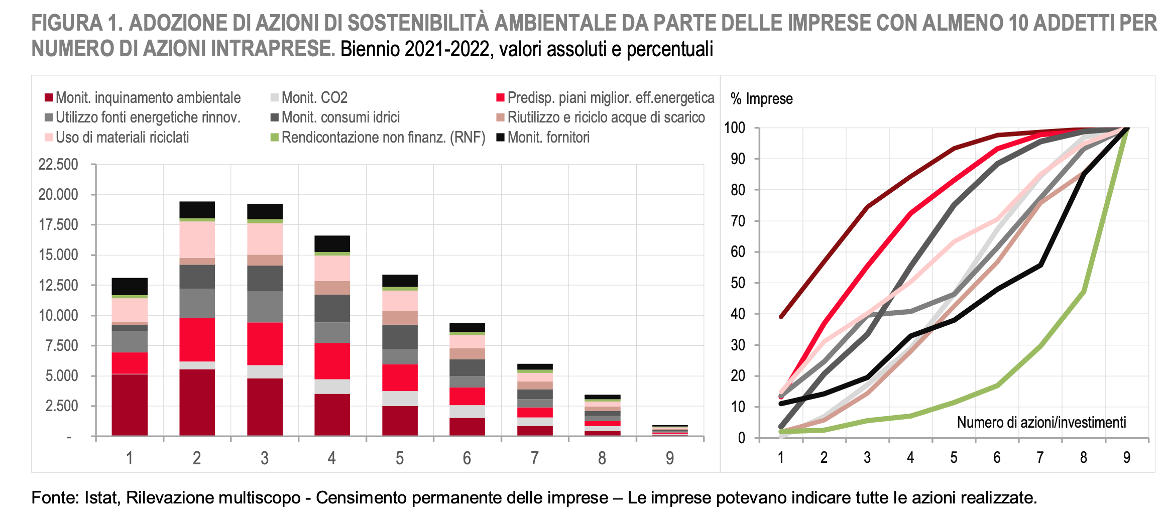 Dall’indagine emerge che sono 39mila le imprese manifatturiere con almeno 10 addetti che dichiarano di avere realizzato nel 2021-2022 almeno un’azione volta a migliorare la sostenibilità ambientale della propria attività, pari al 59,0% del totale. Queste imprese impiegano circa 2 milioni di addetti (75,4%) e producono 217 miliardi di valore aggiunto (81,6%) pari al 70,9% del totale della manifattura. L’Istituto ricorda che la transizione energetica, la riduzione delle emissioni inquinanti e l’utilizzo di tecnologie pulite rientrano tra gli obiettivi strategici delle politiche economiche e industriali definite a livello nazionale ed europeo. E che in particolare, la possibilità di conciliare l’adozione di misure di sostenibilità ambientale con adeguati livelli di performance economica delle imprese rappresenta uno degli elementi centrali dell’attuale dibattito in corso non solo a livello italiano, ma mondiale.