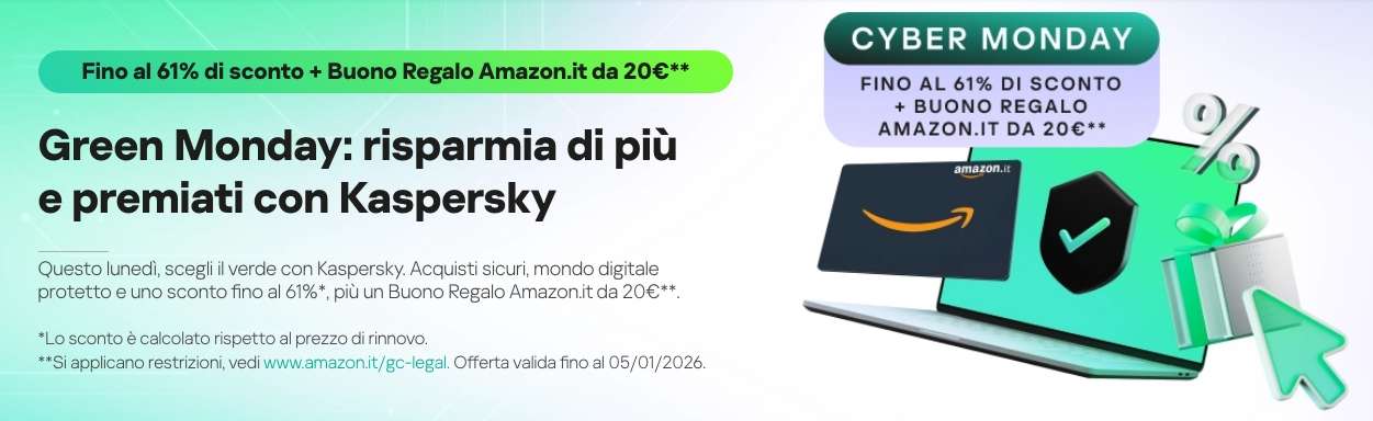 Kaspersky rilancia la sua suite più avanzata, ovvero il [branded_content po_number=”AN104″ program_code=”kspk” format_id=”54″ link=”https://ad.doubleclick.net/ddm/clk/627703853;434601304;b;gdpr=$%7BGDPR%7D;gdpr_consent=$%7BGDPR_CONSENT_755%7D”]piano Premium[/branded_content], con una promozione particolarmente interessante: grazie alla promo del Cyber Monday, chi attiva oggi il piano da 1 anno e 1 dispositivo paga 34,99€ per il primo anno invece di 84,99€ (58% di sconto) e riceve anche una Carta Regalo Amazon da 20€. Scegliendo il piano da 20 dispositivi, lo sconto sale al 61%, ma c’è tempo solo fino al 5 gennaio 2026.
