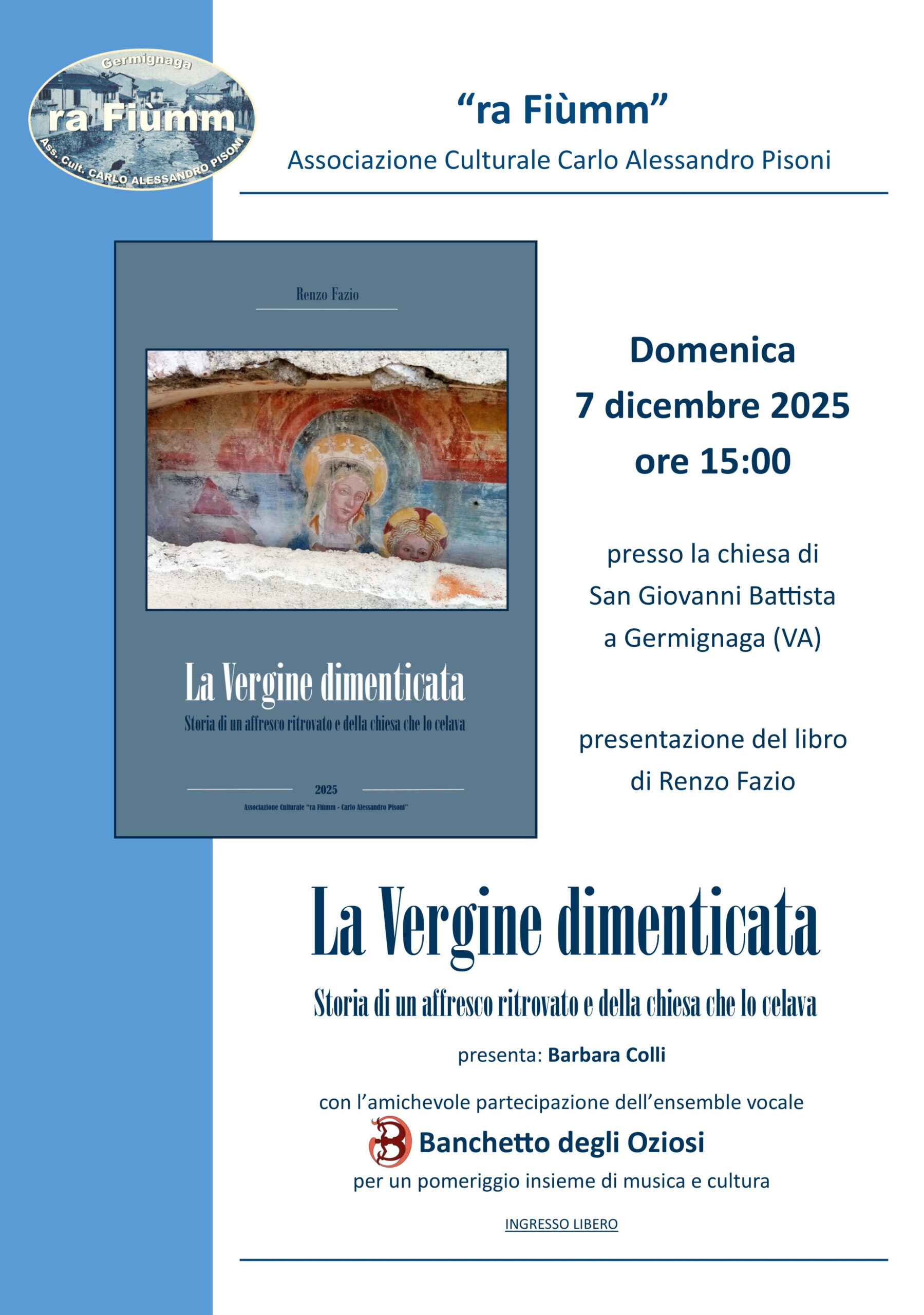 Domenica 7 dicembre 2025, alle ore 15:00, la chiesa di San Giovanni Battista di Germignaga farà da cornice alla presentazione del libro “La Vergine dimenticata – Storia di un affresco ritrovato e della chiesa che lo celava”, scritto da Renzo Fazio e pubblicato con il contributo dell’associazione culturale ra Fiùmm – Carlo Alessandro Pisoni.