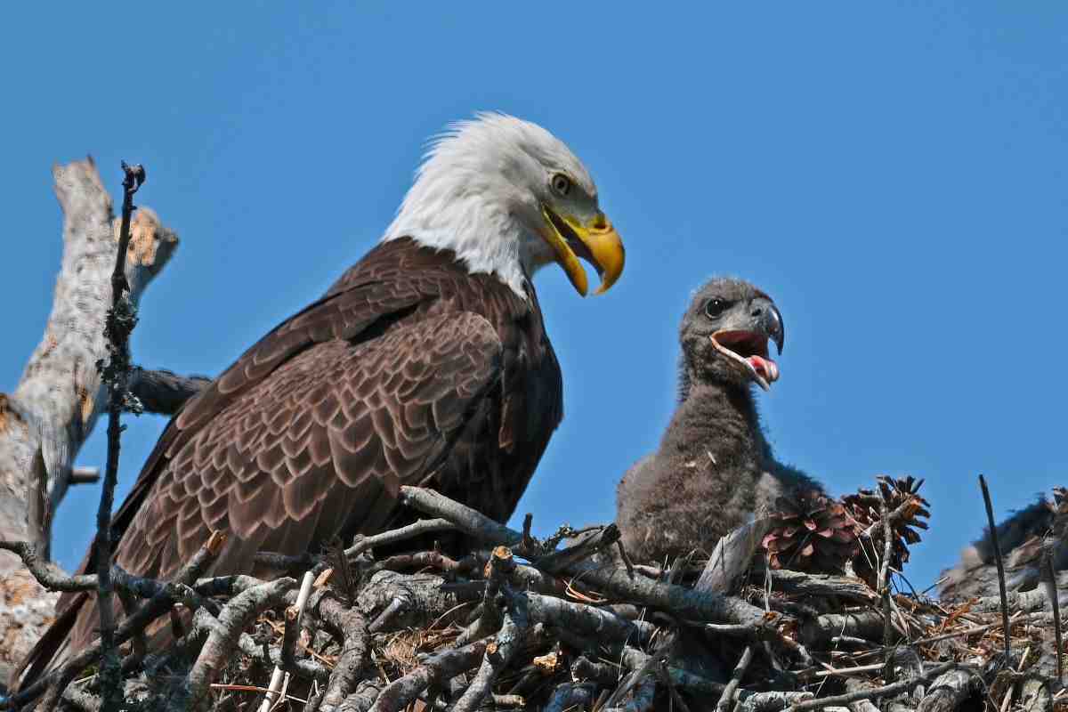 A nutrire il piccolo sarà il maschio, che dopo un periodo d’assenza torna al nido nel momento della schiusa, passati circa 45 giorni di cova. Dopo due mesi, i pulcini diventano aquilotti, ma spiccheranno il volo, solo dopo 160/170 giorni dalla nascita, quando saranno totalmente indipendenti per andarsi poi a riprodurre a loro volta.