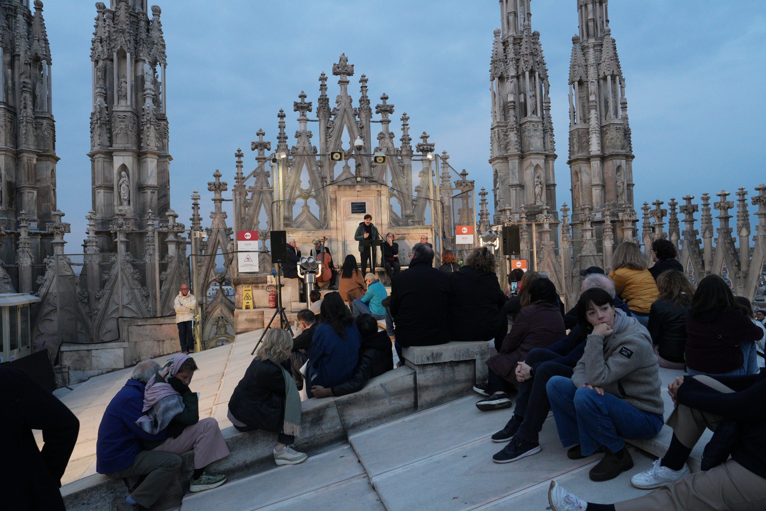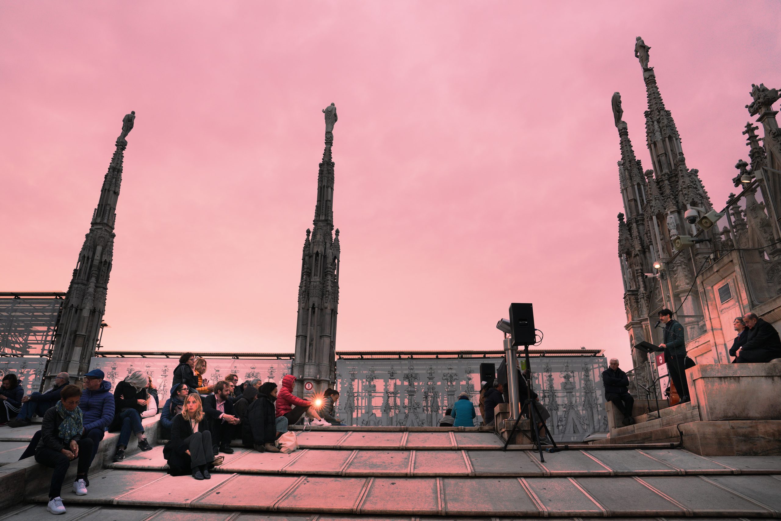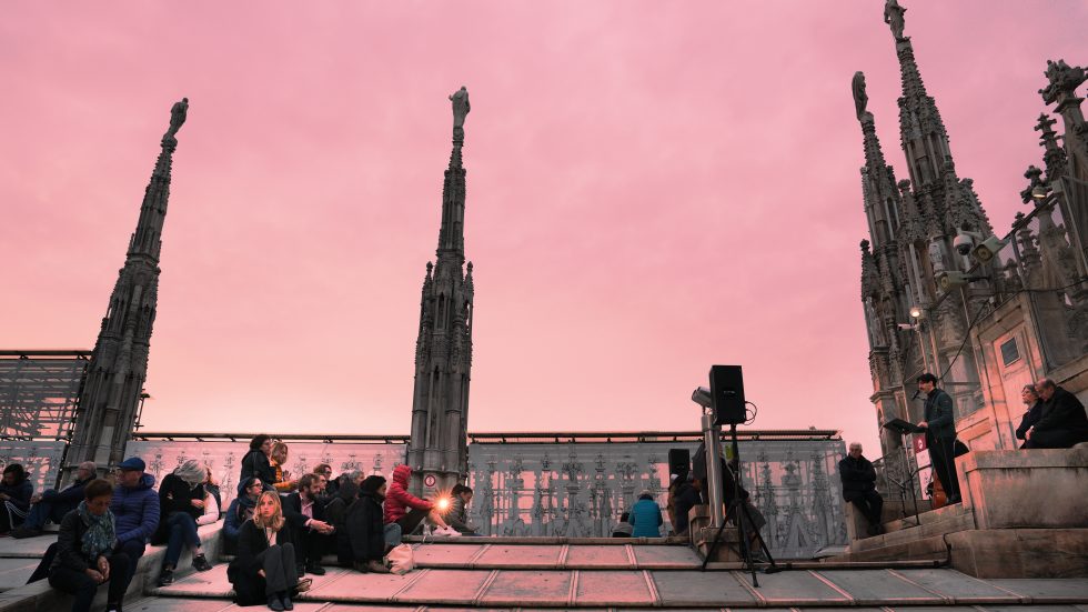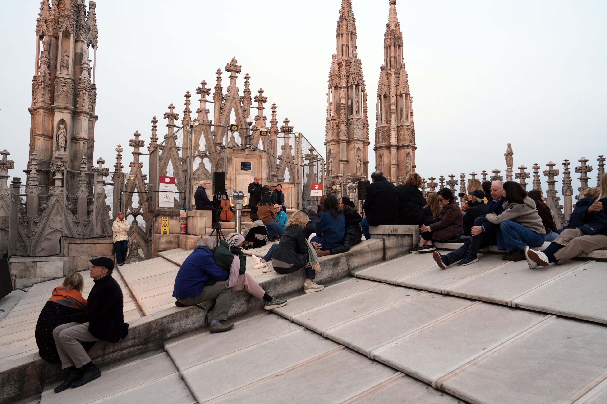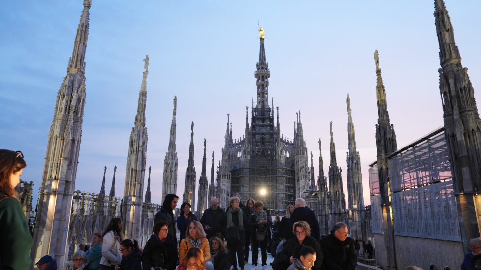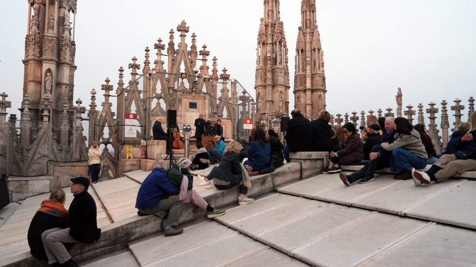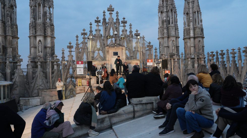 L’affacciarsi del giorno che è avere un nuovo volto, quello dell’aurora, la mitica dea greca e omerica Eos, dalle dita rosate. Salendo sulle Terrazze del Duomo, quasi toccando il cielo che si fa via via più chiaro, tra il buio che si dirada e lascia spazio all’azzurro dell’alba, sembra di vederle e di poterle toccare, le dita che dipingono di rosa l’orizzonte. Tanto che l’Arcivescovo – salito anche lui tra le guglie per vivere il momento magico del sorgere del sole – avvia la sua riflessione proprio dall’immagine di Eos-aurora. Richiamata anche da Luciano Manicardi, biblista e monaco della Comunità di Bose, in apertura dell’happening dal titolo «Viene l’aurora», al quale partecipano un centinaio di persone e che recupera l’appuntamento con cui il 23 marzo scorso avrebbe dovuto concludersi «Soul Festival di Spiritualità 2025», non tenutosi per il maltempo.