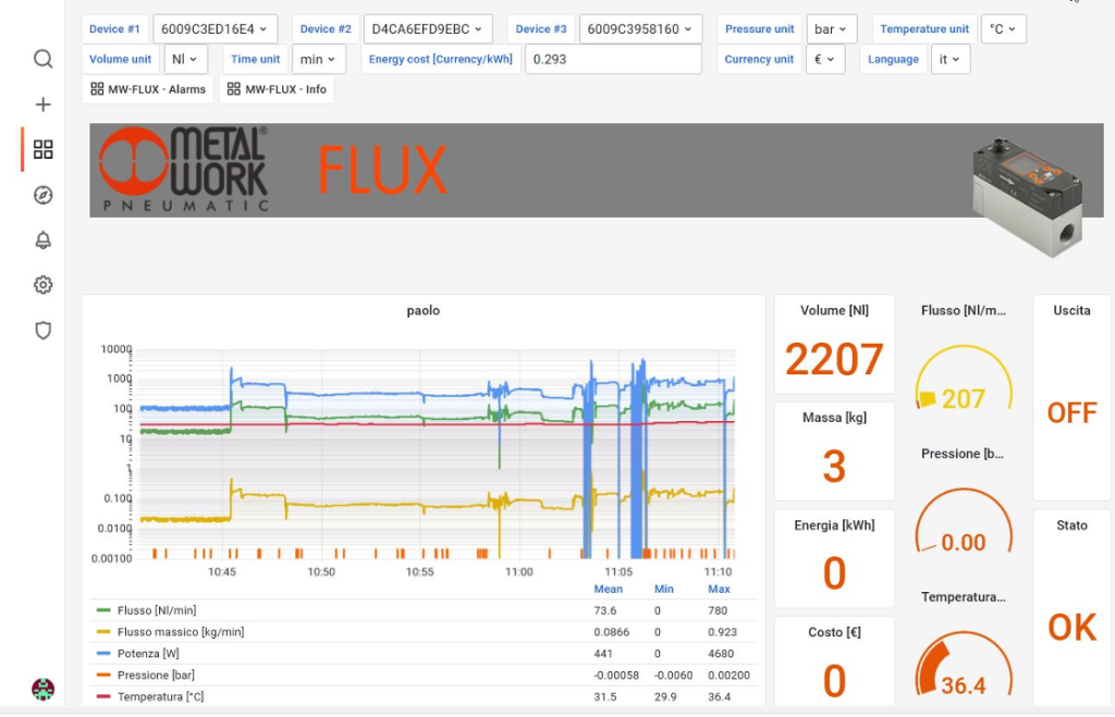 Tramite l’APP, oltre a visualizzare le grandezze misurate, è possibile modificare tutte le impostazioni dei flussimetri e visualizzarne in tempo reale i valori misurati. In questo modo i flussimetri FLUX di Metal Work possono essere configurati e monitorati senza la necessità di un collegamento fisico. I dispositivi della serie FLUX sono quindi compatibili con tutti i sistemi avanzati di raccolta ed elaborazione dati diagnostici e predittivi.