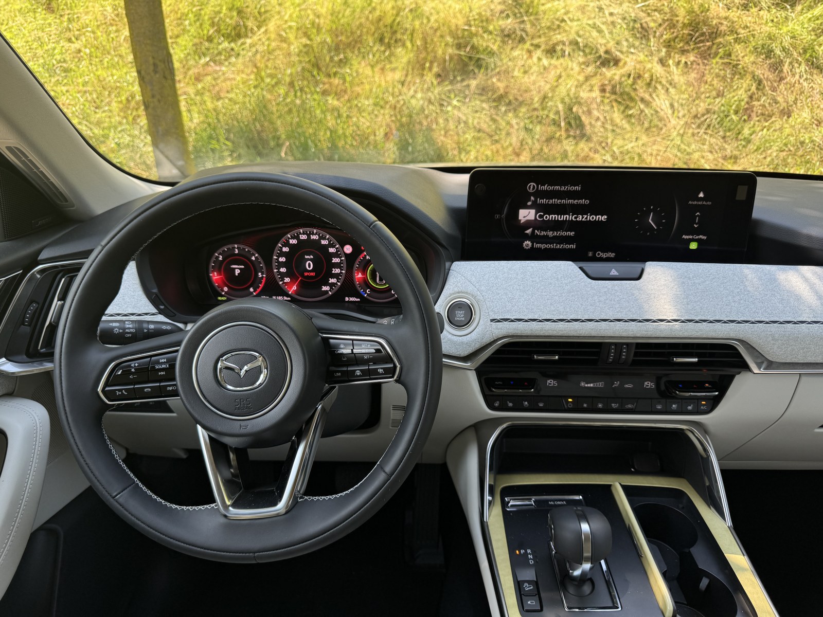 L’abitacolo molto spazioso e anche ben realizzato. I materiali sono per la quasi totalità morbidi al tatto mentre i sedili, riscaldati e ventilati, sono comodi anche dopo diverse ore passate dietro il volante. Proprio come per gli esterni, anche l’ambiente di bordo è studiato seguendo uno stile semplice e razionale: ogni cosa è dove ci si aspetta di trovarla, insomma ci si sente subito a proprio agio a bordo di questa CX-60. Il cruscotto posto di fronte al guidatore sfrutta un display da 12,3 pollici e dall’aspetto old school: ci sono tre elementi tondi e lancette digitali, ma è anche presente un moderno l’head-up display che proietta le indicazioni di guida e i dati di marcia direttamente sul parabrezza. Anche lo schermo centrale è da 12,3 pollici e viene gestito tramite una rotella posizionata nel tunnel centrale, anche lei un pochino vecchio stampo. Ho trovato il layout di questo sistema un po’ obsoleto, e non allo stesso livello di quelli più moderni, nonostante sia reattivo e soprattutto è “touch” solo quando si utilizzano Apple CarPlay o Android Auto. Apprezzo invece i comandi fisici del climatizzatore automatico bizona che sono facili da raggiungere. Il bagagliaio sfrutta un portellone davvero ampio ma con una soglia di carico abbastanza alta, la capienza del vano è di 570 litri, che arrivano 1.726 litri abbattendo il divano posteriore.