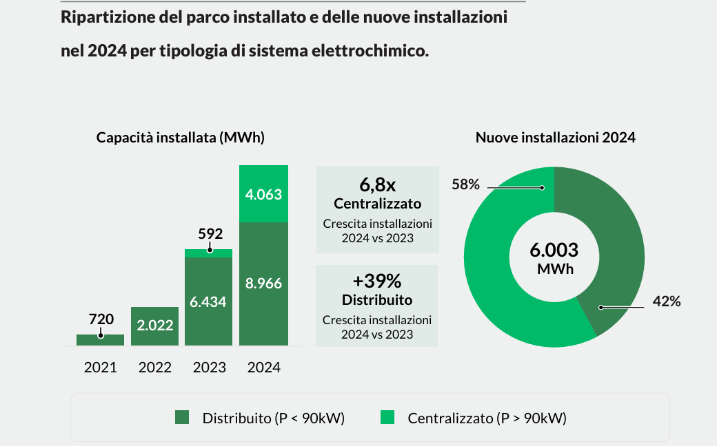 Nonostante la crescita significativa, permane un ampio divario (58 GWh) rispetto agli obiettivi per il 2030 dello scenario Terna-Snam. Entrambe le categorie di sistemi richiederanno un’accelerazione significativa, ma per il segmento centralizzato sarebbe necessario un CAGR pari al 56% fino a fine decennio.