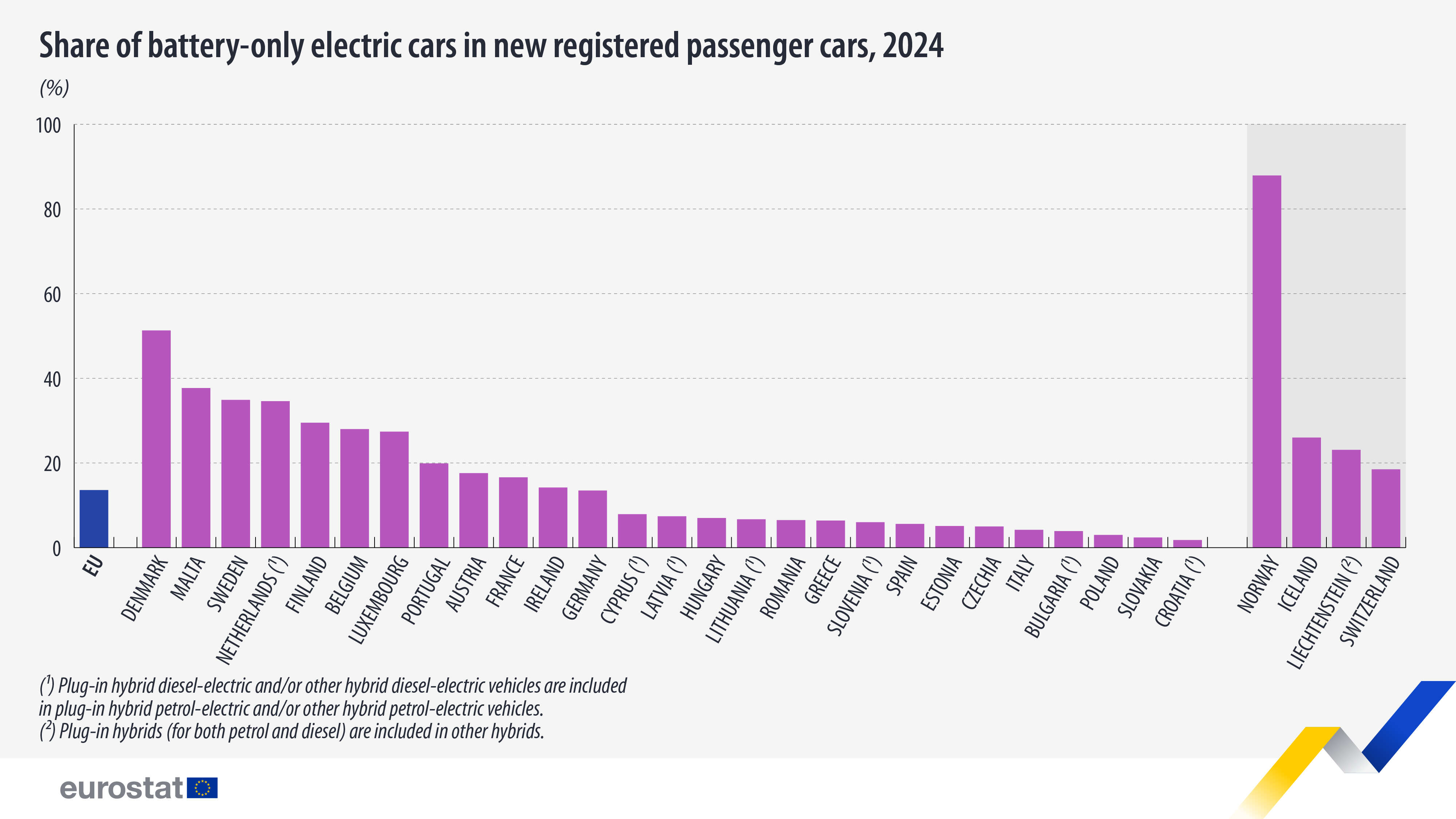 Le quote più elevate di auto elettriche a batteria tra le nuove auto immatricolate sono state rilevate in Danimarca (51,3%), Malta (37,7%) e Svezia (34,9%). Le quote più basse sono state invece registrate in Croazia (1,8%), Slovacchia (2,4%), Polonia (3,0%). E poi, subito sopra ma comunque in fondo alla classifica, Bulgaria e Italia.