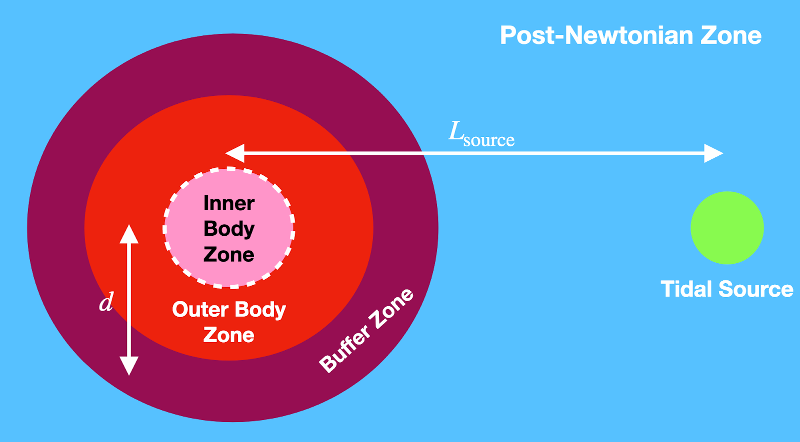 Per affrontare questi ostacoli, il team di Yunes ha suddiviso il problema in parti più semplici, concentrandosi su una stella e vedendo la sua partner come una fonte di marea. Se riuscissero ad applicare le condizioni al contorno nel modo giusto, potrebbero riuscire a trovare un insieme completo di modalità. Partendo da un insieme di equazioni linearizzate di Einstein-Eulero, che descrivono come la materia genera campi gravitazionali ed evolve nello spaziotempo, hanno diviso l’interno e l’esterno della stella in regioni distinte (vedi diagramma): una zona di gravità forte e una zona di gravità debole.