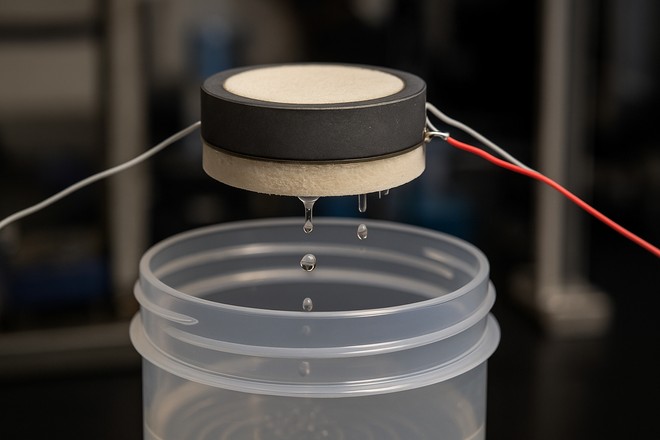 La nuova tecnologia si basa su un attuatore a ultrasuoni composto da un anello ceramico piatto. Quando viene applicata una tensione elettrica, l’anello vibra producendo onde sonore superiori a 20.000 hertz, cioè al di sopra della soglia udibile per l’essere umano. A queste frequenze, la struttura molecolare dell’acqua subisce una perturbazione sufficiente a rompere i legami deboli che la tengono ancorata al sorbente. Il risultato è una sorta di “scuotimento mirato”: piccole goccioline si liberano dalla superficie del materiale e vengono convogliate attraverso una serie di minuscole aperture verso recipienti di raccolta.