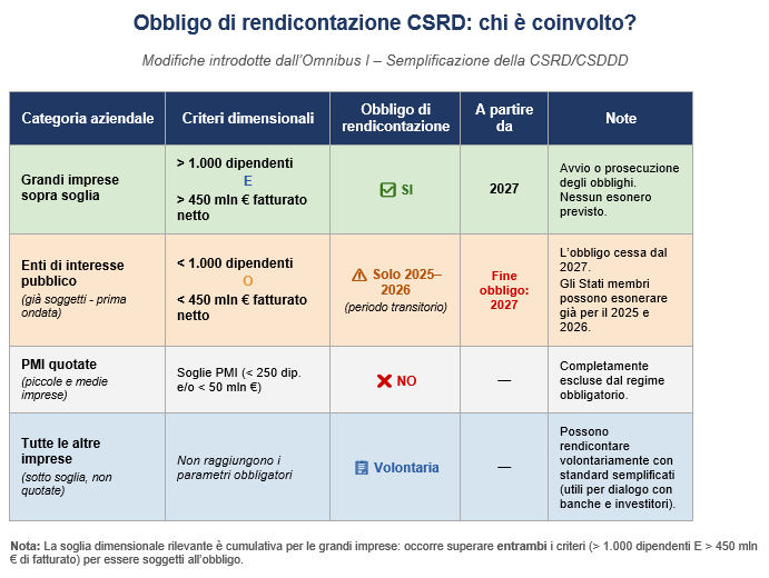 Le piccole e medie imprese quotate sono state completamente escluse dal regime di rendicontazione obbligatoria per ridurre ulteriormente gli oneri amministrativi. Le aziende che rimangono fuori dal perimetro obbligatorio possono comunque scegliere di effettuare una rendicontazione volontaria, utilizzando standard semplificati appositamente sviluppati per facilitare il dialogo con banche e investitori.
