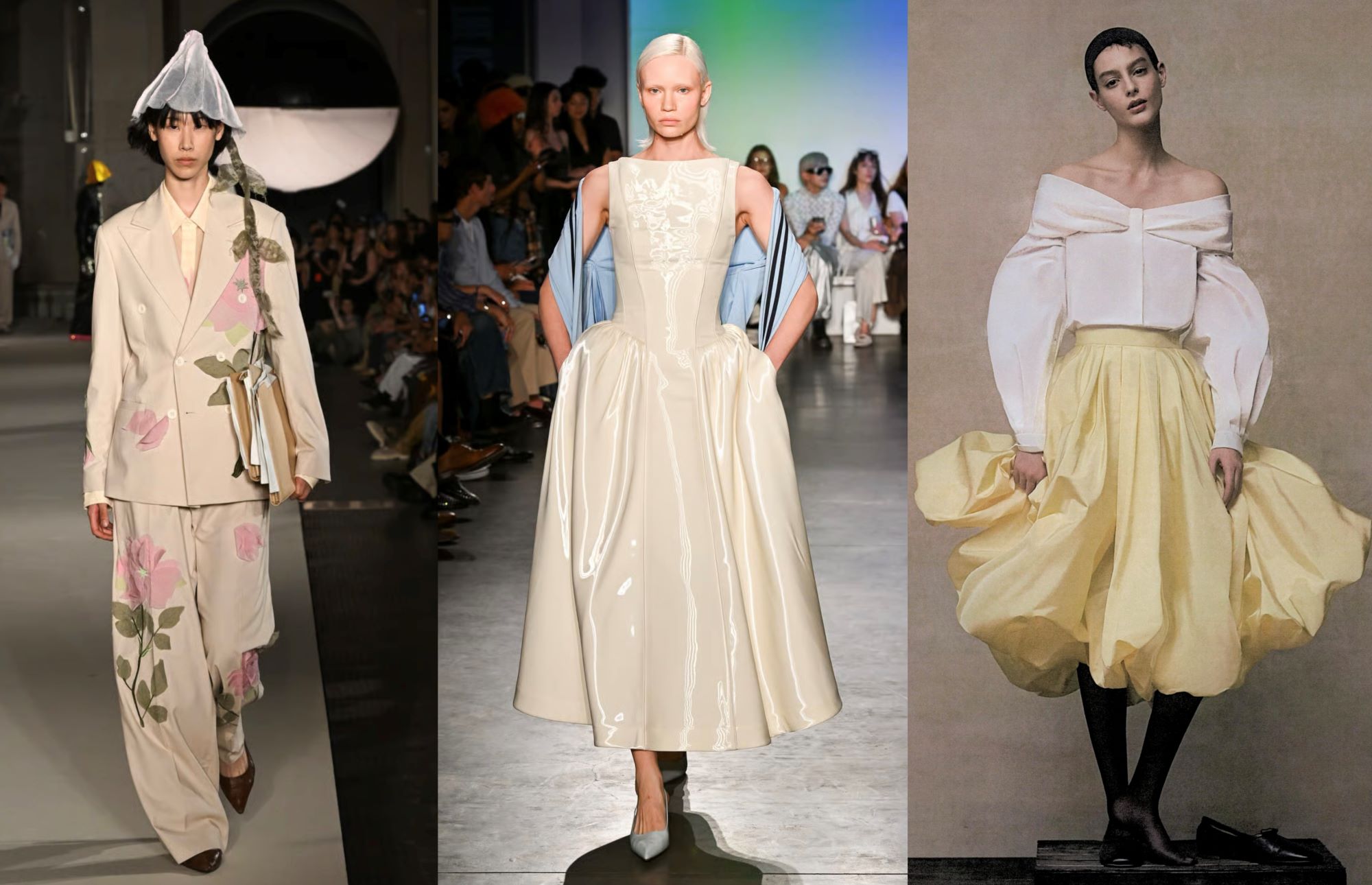 Le influenze stilistiche si intrecciano poi, dando spazio alla tendenza boho-gipsy fatta di frange in movimento e leggerezza, in grado di evocare un senso di libertà spontanea. Il risultato è uno stile che sfugge alle regole, ma proprio per questo riesce a esprimere una femminilità libera e profondamente attuale. In questa direzione si inserisce Alix of Bohemia, che decodifica tale immaginario attraverso dettagli artigianali, tessuti ricercati e silhouette fluide. Le frange non sono solo decorative, ma accompagnano quindi il movimento, rendendo ogni capo dinamico. Gli abiti voluminosi ridefiniscono poi la silhouette attraverso proporzioni ampie e costruzioni scenografiche. Linee fluide ma ben strutturate si combinano con colori audaci, creando look d’impatto. A rappresentare al meglio questo trend è RVNG. Ogni capo scolpisce la figura con precisione, trasformando l’ampiezza in un segno distintivo di eleganza contemporanea.