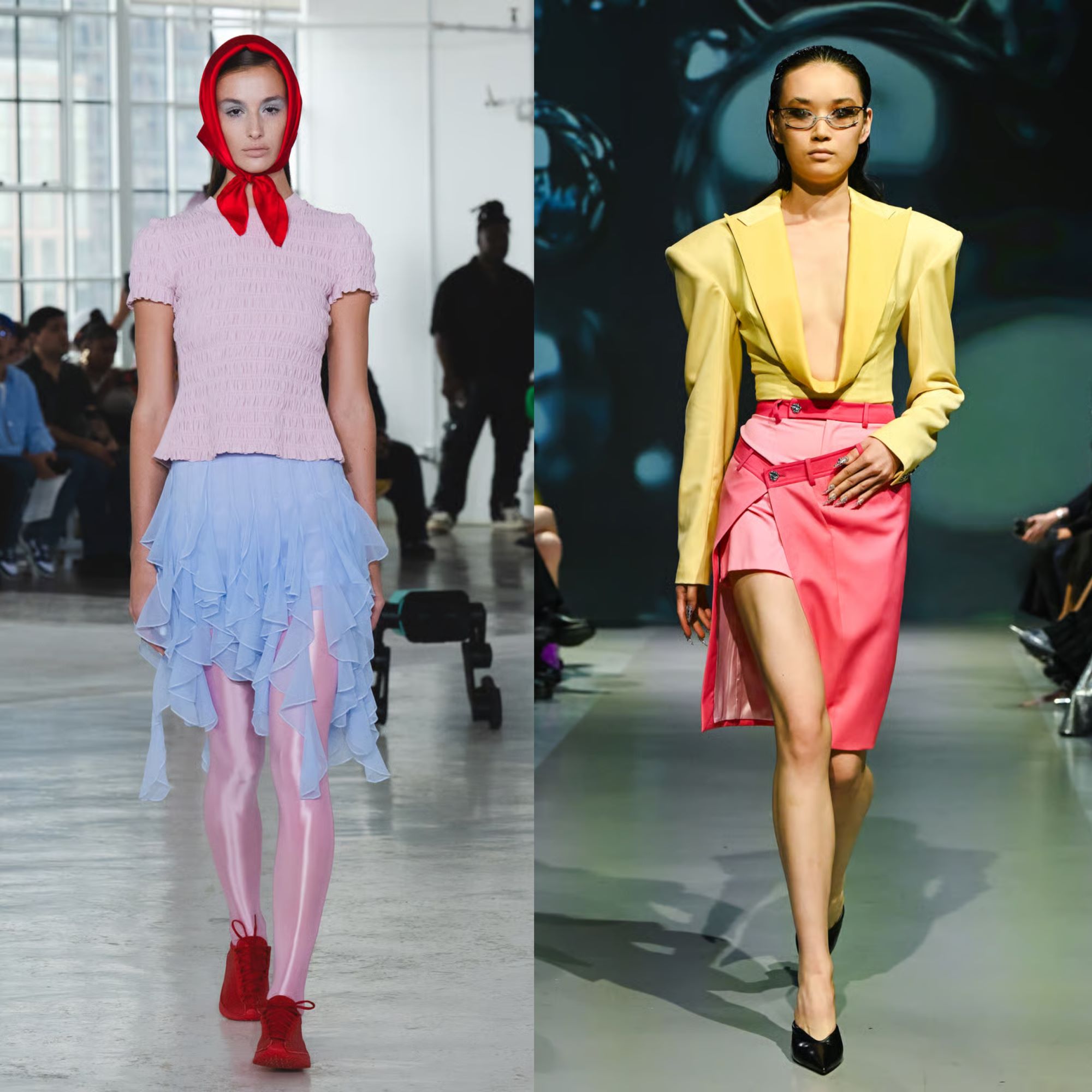 Accanto a questa armonia cromatica emerge la tendenza del color block, che rompe gli schemi con accostamenti più decisi, come rosso e rosa, giallo e fucsia. Non è solo una scelta estetica, ma un modo per affermare presenza e sicurezza, trasformando il colore in un vero linguaggio visivo. A interpretare al meglio questo trend sono Private Policy e SHAO. Nelle loro collezioni, i contrasti cromatici diventano narrativi, creando look dinamici e immediatamente riconoscibili.