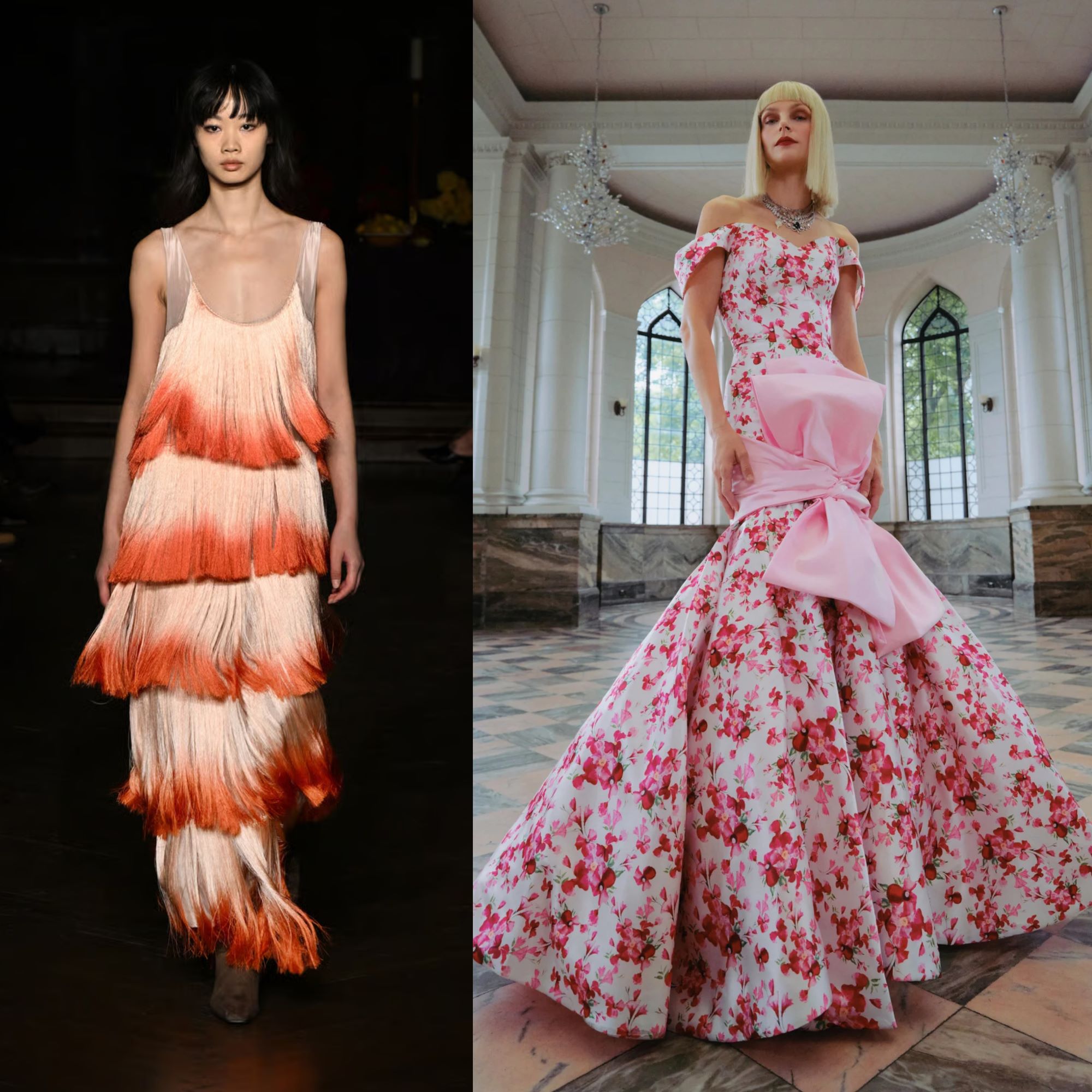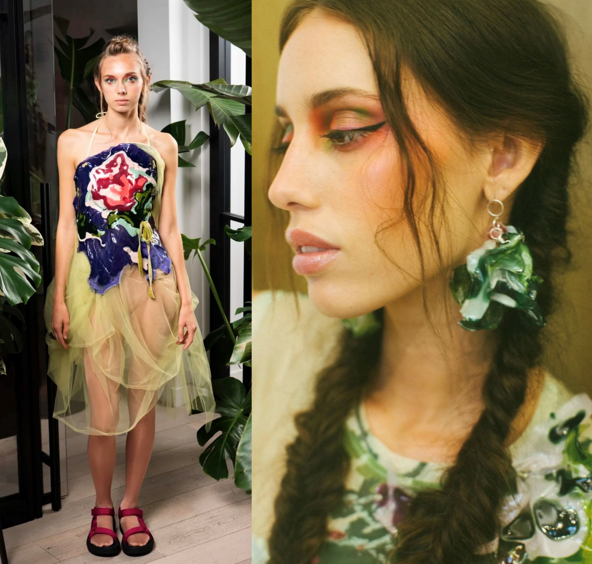 Le trasparenze non sono più solo sensuali, ma giocano con i livelli e la percezione. Tra le interpretazioni più interessanti di questa tendenza c’è quella di Caroline Zimbalist, che porta i fiori fuori dalla dimensione puramente decorativa, per renderli parte strutturale del capo e del gioiello, attraverso l’utilizzo di biomateriali. I suoi corsetti e abiti, così come anelli, spille e orecchini, dialogano con il tema della tridimensionalità e del volume. Un approccio che fonde estetica e innovazione, ridefinendo in modo contemporaneo il rapporto tra moda e natura.