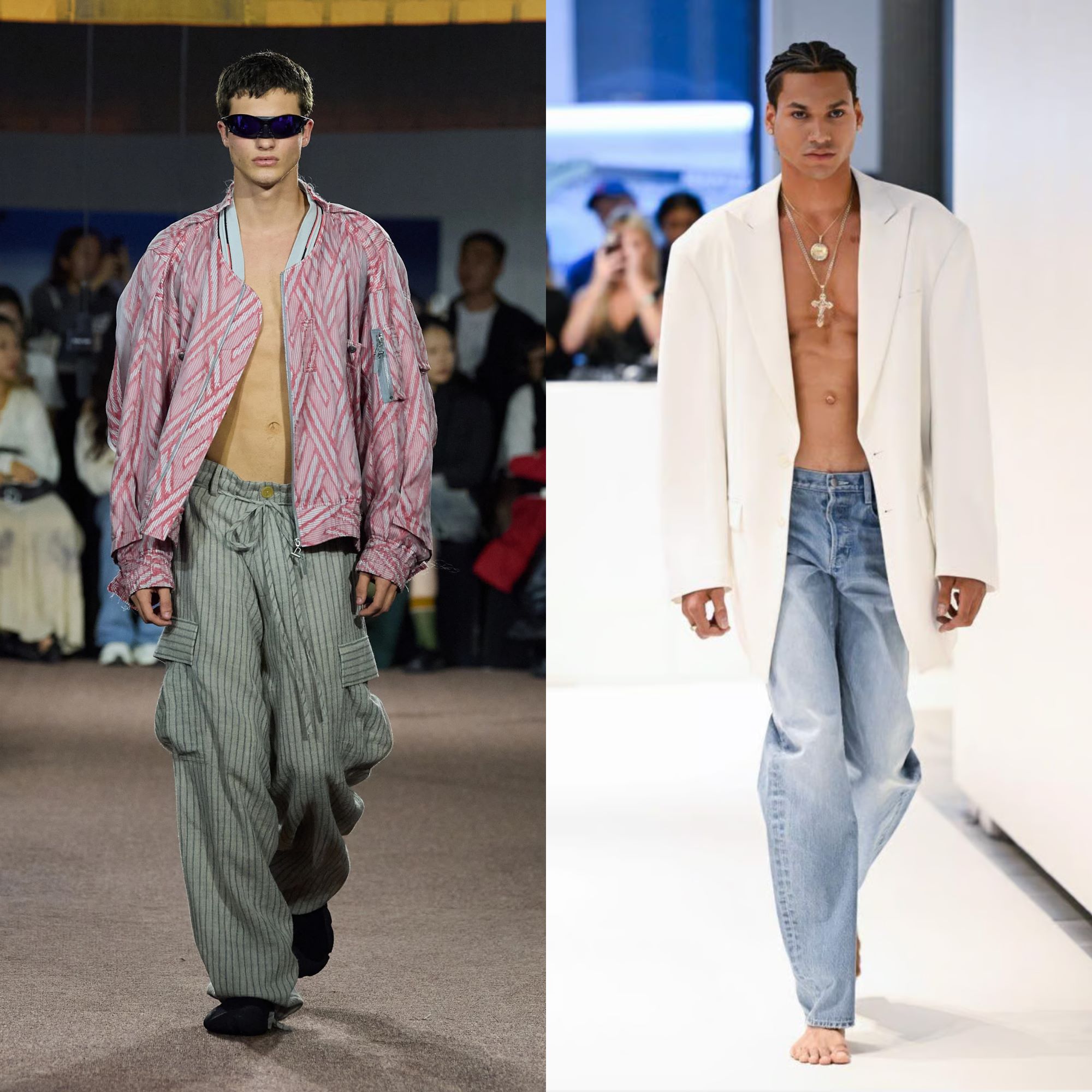 Le proporzioni cambiano e con loro il modo di muoversi nello spazio urbano. I pantaloni morbidi o voluminosi ampliano la silhouette, creando un senso di comfort che rispecchia il ritmo della città, definendo un nuovo equilibrio tra comodità e presenza scenica. Jarel Zhang lavora proprio su questo concetto, costruendo volumi che dialogano con il corpo in modo fluido ma deciso, ridefinendo le proporzioni in chiave moderna.