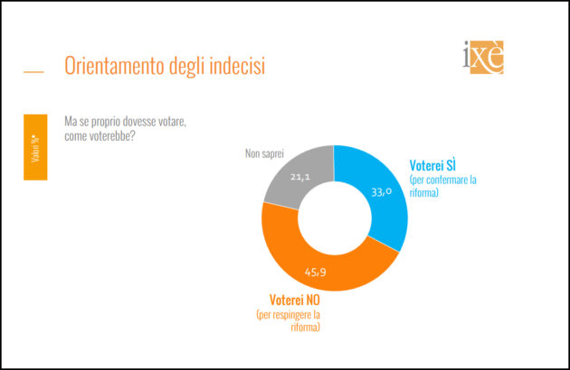 A un mese dal voto, le urne si aprono il 22 e 23 marzo, per Ixè il fronte del No è collocato tra il 51,3% e il 54,3% mentre il Sì è nella finestra 45,7%-48,7%. Un distacco in favore del No che va da un minimo di 2,5 punti a un massimo di 9,5, per una media di sei. Il dato ribalta gli equilibri rispetto al sondaggio di novembre realizzato sempre da Ixè, quando avanti era il Sì (53% – 47%), mentre a gennaio si era stimato una sorta di “pareggio tecnico” tra i due fronti da parte dell’Osservatorio politico nazionale dell’istituto fondato da Roberto Weber.