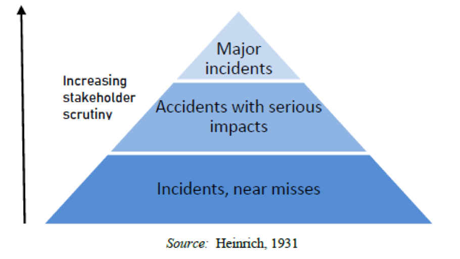 Gli incidenti vengono classificati in una scala basata sulle loro conseguenze e va dal minimo di 1 (danni limitati al sito con costi inferiori a 10K euro) al massimo di grado 5 di tipo catastrofico e che coinvolgono in modo più che significativo l’ambiente circostante al sito dove avviene l’incidente. Al di là della scala incidentale viene sottolineata l’importanza di includere nei report di base per le analisi anche i “quasi incidenti (“near misses”) richiamando esplicitamente il triangolo di Heinrich del 1931 in cui si evidenzia la correlazione tra incidenti limitati e quasi incidenti e quelli via via più devastanti.