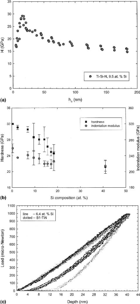 Grafico della durezza apparente in funzione della profondità di indentazione per un rivestimento Ti–Si–N (~9,5 at.% Si), con picco di durezza superiore a 25 GPa su spessori <50 nm. Fonte: S. PalDey, S.C. Deevi, Single Layer and Multilayer Wear Resistant Coatings of (Ti,Al)N: A Review, Materials Science and Engineering: A, 342, 2003, pp. 58–79.