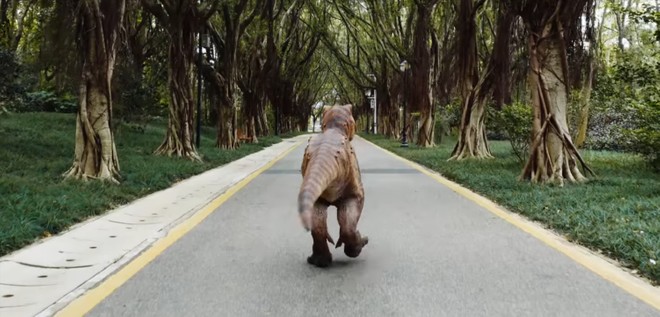 Il filmato aperto al pubblico ritrae una scena curiosa: il T-Rex robotico, già rivestito da una pelle artificiale completa di cranio scolpito, arti anteriori ridotti e una lunga coda mobile, riposa su un tratto di pavimentazione mentre i presenti si avvicinano incuriositi.