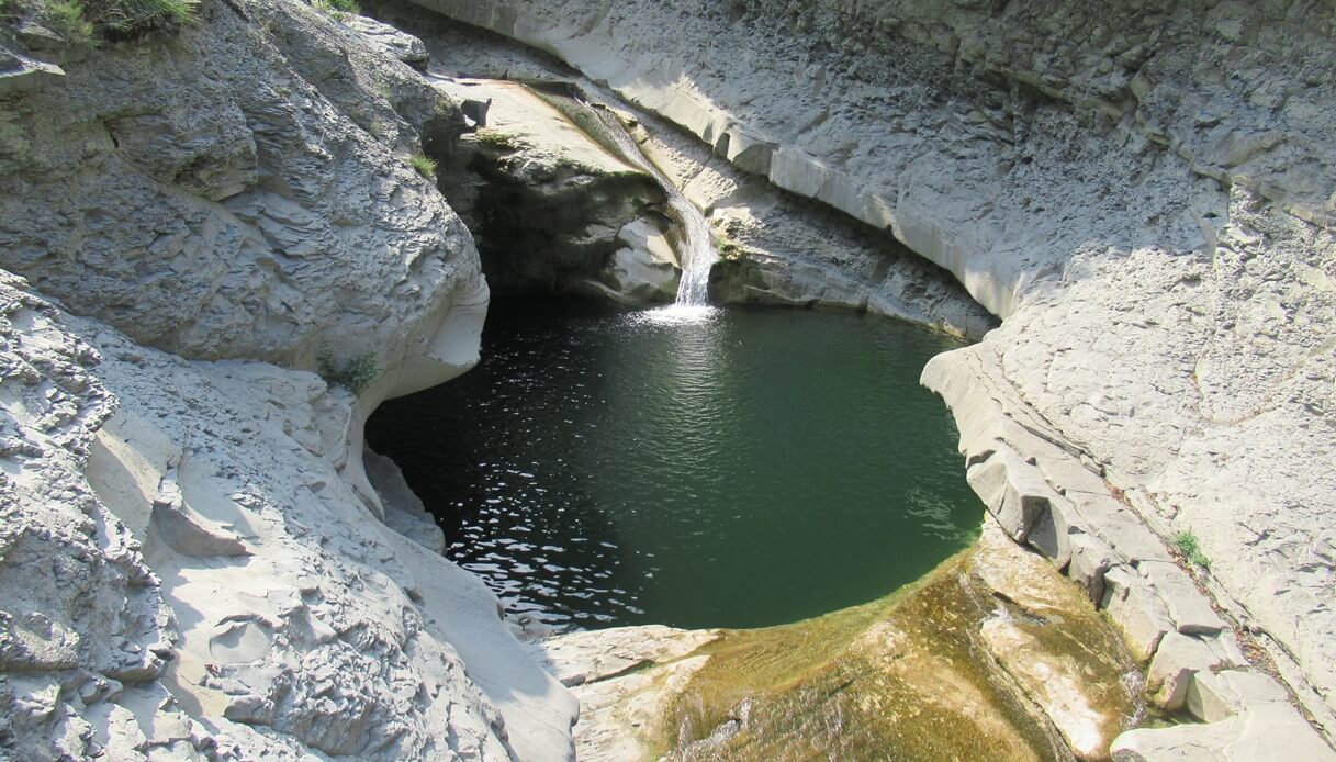 La piscina naturale più in basso, dove si riversa la seconda cascata e inizia il tratto rettilineo e pianeggiante del corso d’acqua, è invece più larga e sembra davvero non avere fondo. Le grandi rocce piatte che corredano il contesto sono l’ideale per prendere il sole o imbandire un picnic in riva alle acque smeraldine del Bidente.
