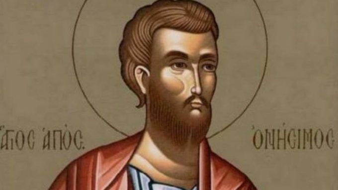 Onesimo (in greco significa “utile”) è il nome che Filemone aveva dato al suo giovane schiavo che però, dopo averlo derubato, non più “utile” ma “disutile”, era fuggito a Roma, dove si trovava prigioniero san Paolo (anni 61-63). Onesimo andò a cercare l’apostolo nell’alloggio che aveva affittato, e dove poteva ricevere liberamente visite, e qui ricevette il battesimo. Paolo avrebbe voluto trattenere presso di sé il giovane discepolo anche per avere il suo aiuto nelle piccole incombenze di ogni giorno, ma questi era ancora schiavo di Filemone, e così glielo rimandò, insieme a Tichico che partiva per l’Asia (Col 4,7 ss.).