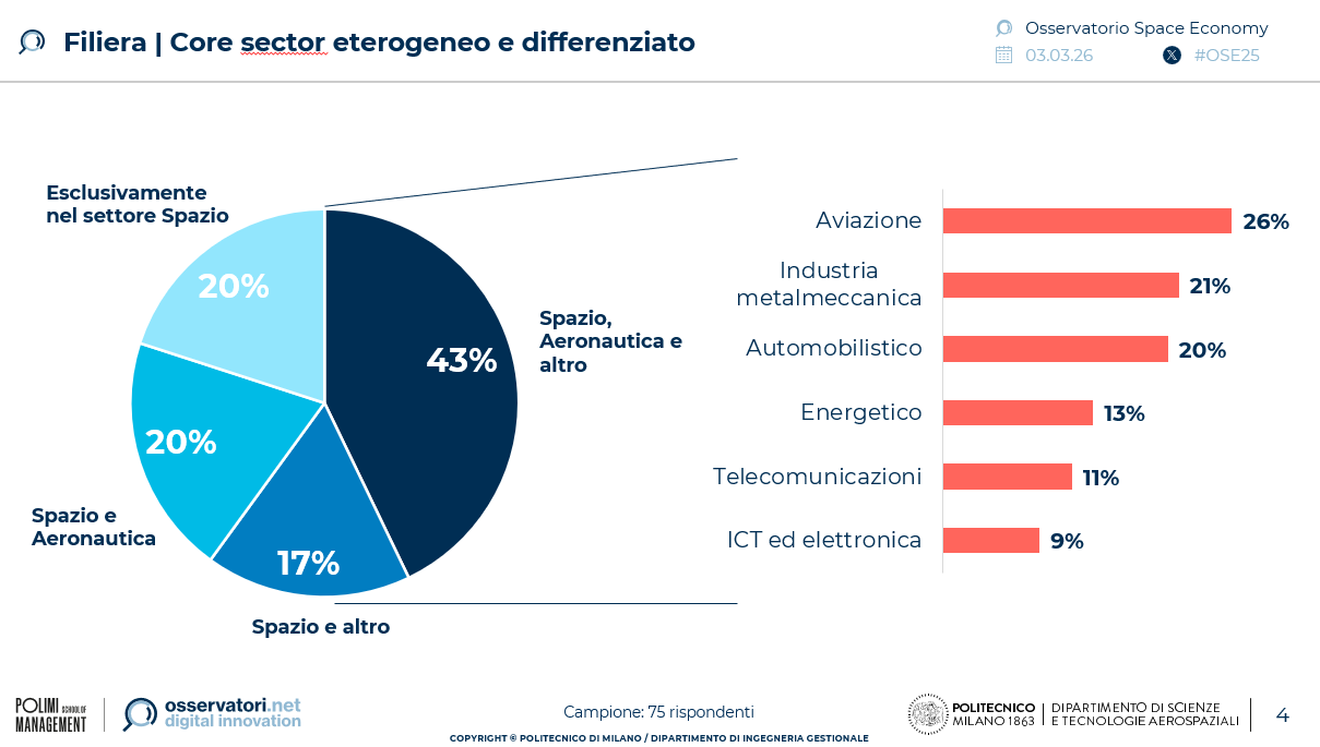 La filiera dell’industria spaziale italiana oggi appare articolata, il 60% delle imprese integra attività spaziali con altri comparti complementari e adiacenti. I settori più citati includono aviazione (26%), metalmeccanico (21%), automobilistico (20%).