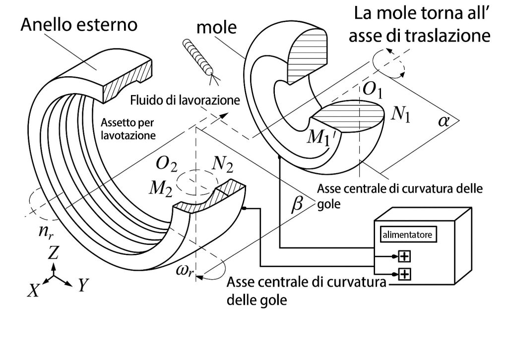 La ECM utilizza la dissoluzione anodica controllata: il pezzo funge da anodo, mentre un utensile catodico sagomato dirige la rimozione del materiale (figura 1). Non essendoci contatto fisico, il processo elimina deformazioni e stress. È ideale per la lavorazione delle piste dei cuscinetti, garantendo superfici lisce senza strati alterati e una maggiore resistenza a fatica.