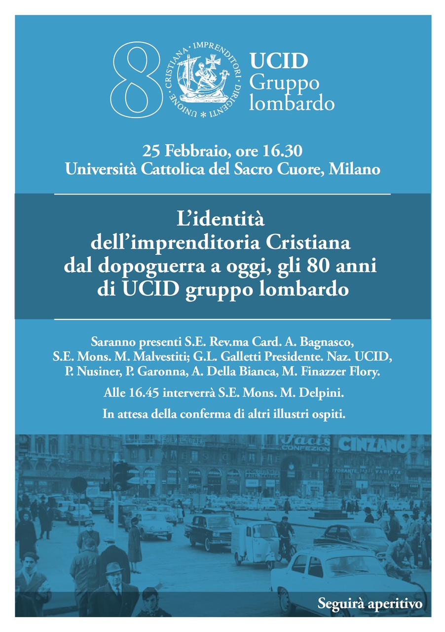 Un momento del Giubileo degli imprenditori a Milano nel giugno 2025 (Agenzia Fotogramma)«L’identità dell’Imprenditoria cristiana dal dopoguerra a oggi» è il tema del convegno, in programma all’Università Cattolica del Sacro Cuore, mercoledì 25 febbraio dalle 16.30, con cui il Gruppo lombardo dell’Unione Cristiana Imprenditori Dirigenti (Ucid) festeggia i propri 80 anni. Insieme ad altri relatori – tra i quali il cardinale Angelo Bagnasco, già presidente della Cei – interverrà l’Arcivescovo, monsignor Mario Delpini.