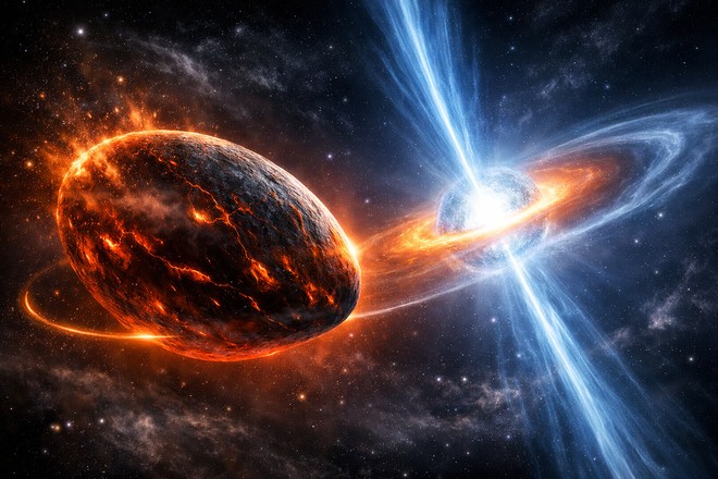 PSR J2322-2650b ha una massa paragonabile a quella di Giove, ma si trova a una distanza estremamente ridotta dalla sua pulsar, circa 1,6 milioni di chilometri, completando un’orbita in sole 7 ore e 48 minuti. Le forze gravitazionali e la rotazione rapidissima della stella compatta deformano il pianeta, che assume una forma allungata, descritta dai ricercatori come simile a quella di un limone. Un ambiente estremo, dominato da radiazioni intense e da maree gravitazionali potentissime.